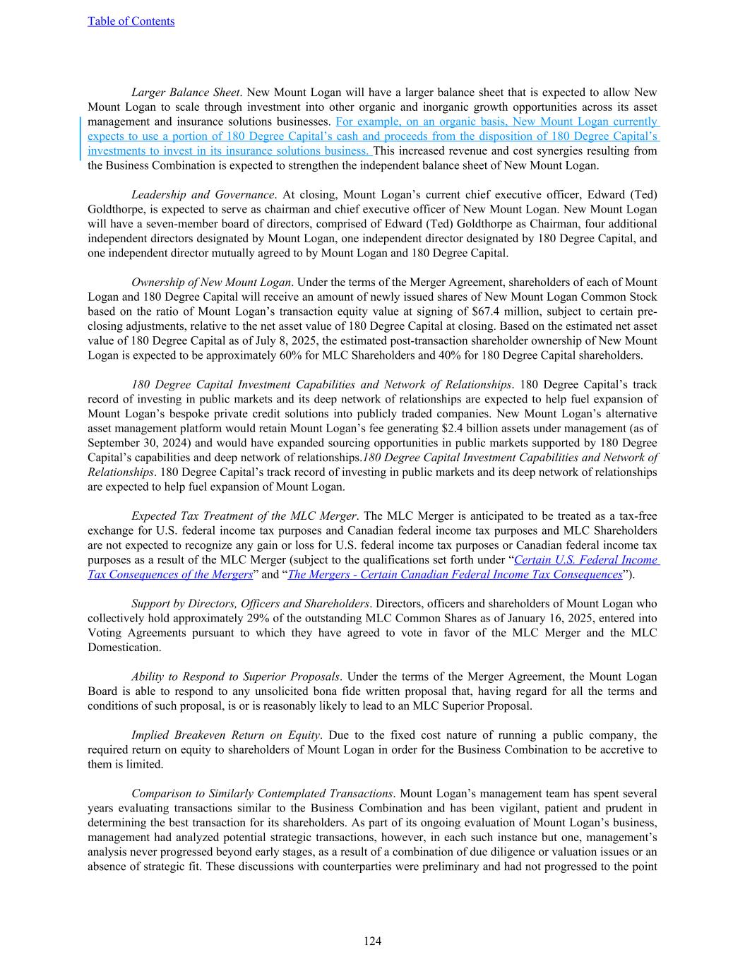Larger Balance Sheet. New Mount Logan will have a larger balance sheet that is expected to allow New Mount Logan to scale through investment into other organic and inorganic growth opportunities across its asset management and insurance solutions businesses. For example, on an organic basis, New Mount Logan currently expects to use a portion of 180 Degree Capital’s cash and proceeds from the disposition of 180 Degree Capital’s investments to invest in its insurance solutions business. This increased revenue and cost synergies resulting from the Business Combination is expected to strengthen the independent balance sheet of New Mount Logan. Leadership and Governance. At closing, Mount Logan’s current chief executive officer, Edward (Ted) Goldthorpe, is expected to serve as chairman and chief executive officer of New Mount Logan. New Mount Logan will have a seven-member board of directors, comprised of Edward (Ted) Goldthorpe as Chairman, four additional independent directors designated by Mount Logan, one independent director designated by 180 Degree Capital, and one independent director mutually agreed to by Mount Logan and 180 Degree Capital. Ownership of New Mount Logan. Under the terms of the Merger Agreement, shareholders of each of Mount Logan and 180 Degree Capital will receive an amount of newly issued shares of New Mount Logan Common Stock based on the ratio of Mount Logan’s transaction equity value at signing of $67.4 million, subject to certain pre- closing adjustments, relative to the net asset value of 180 Degree Capital at closing. Based on the estimated net asset value of 180 Degree Capital as of July 8, 2025, the estimated post-transaction shareholder ownership of New Mount Logan is expected to be approximately 60% for MLC Shareholders and 40% for 180 Degree Capital shareholders. 180 Degree Capital Investment Capabilities and Network of Relationships. 180 Degree Capital’s track record of investing in public markets and its deep network of relationships are expected to help fuel expansion of Mount Logan’s bespoke private credit solutions into publicly traded companies. New Mount Logan’s alternative asset management platform would retain Mount Logan’s fee generating $2.4 billion assets under management (as of September 30, 2024) and would have expanded sourcing opportunities in public markets supported by 180 Degree Capital’s capabilities and deep network of relationships.180 Degree Capital Investment Capabilities and Network of Relationships. 180 Degree Capital’s track record of investing in public markets and its deep network of relationships are expected to help fuel expansion of Mount Logan. Expected Tax Treatment of the MLC Merger. The MLC Merger is anticipated to be treated as a tax-free exchange for U.S. federal income tax purposes and Canadian federal income tax purposes and MLC Shareholders are not expected to recognize any gain or loss for U.S. federal income tax purposes or Canadian federal income tax purposes as a result of the MLC Merger (subject to the qualifications set forth under “Certain U.S. Federal Income Tax Consequences of the Mergers” and “The Mergers - Certain Canadian Federal Income Tax Consequences”). Support by Directors, Officers and Shareholders. Directors, officers and shareholders of Mount Logan who collectively hold approximately 29% of the outstanding MLC Common Shares as of January 16, 2025, entered into Voting Agreements pursuant to which they have agreed to vote in favor of the MLC Merger and the MLC Domestication. Ability to Respond to Superior Proposals. Under the terms of the Merger Agreement, the Mount Logan Board is able to respond to any unsolicited bona fide written proposal that, having regard for all the terms and conditions of such proposal, is or is reasonably likely to lead to an MLC Superior Proposal. Implied Breakeven Return on Equity. Due to the fixed cost nature of running a public company, the required return on equity to shareholders of Mount Logan in order for the Business Combination to be accretive to them is limited. Comparison to Similarly Contemplated Transactions. Mount Logan’s management team has spent several years evaluating transactions similar to the Business Combination and has been vigilant, patient and prudent in determining the best transaction for its shareholders. As part of its ongoing evaluation of Mount Logan’s business, management had analyzed potential strategic transactions, however, in each such instance but one, management’s analysis never progressed beyond early stages, as a result of a combination of due diligence or valuation issues or an absence of strategic fit. These discussions with counterparties were preliminary and had not progressed to the point Table of Contents 124
