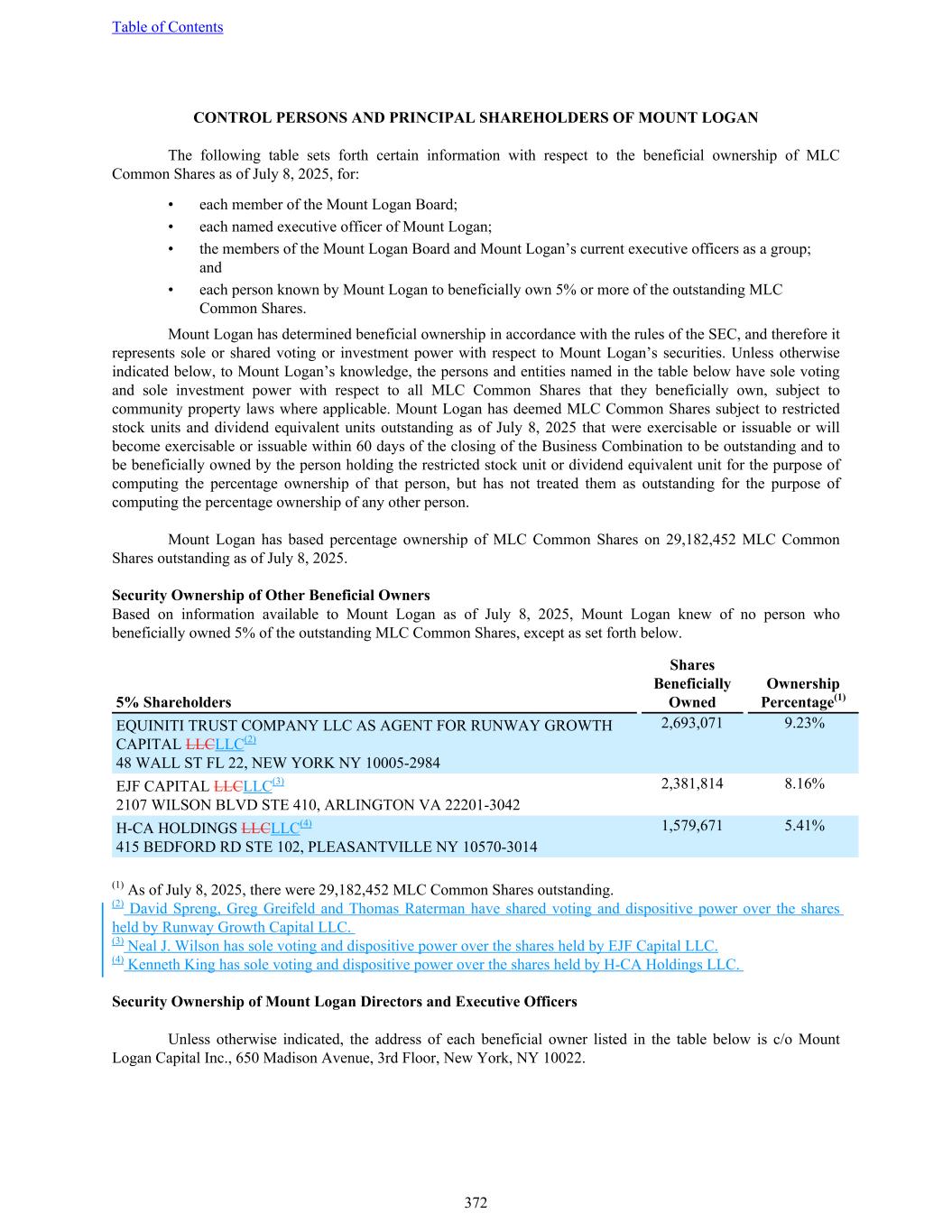 CONTROL PERSONS AND PRINCIPAL SHAREHOLDERS OF MOUNT LOGAN The following table sets forth certain information with respect to the beneficial ownership of MLC Common Shares as of July 8, 2025, for: • each member of the Mount Logan Board; • each named executive officer of Mount Logan; • the members of the Mount Logan Board and Mount Logan’s current executive officers as a group; and • each person known by Mount Logan to beneficially own 5% or more of the outstanding MLC Common Shares. Mount Logan has determined beneficial ownership in accordance with the rules of the SEC, and therefore it represents sole or shared voting or investment power with respect to Mount Logan’s securities. Unless otherwise indicated below, to Mount Logan’s knowledge, the persons and entities named in the table below have sole voting and sole investment power with respect to all MLC Common Shares that they beneficially own, subject to community property laws where applicable. Mount Logan has deemed MLC Common Shares subject to restricted stock units and dividend equivalent units outstanding as of July 8, 2025 that were exercisable or issuable or will become exercisable or issuable within 60 days of the closing of the Business Combination to be outstanding and to be beneficially owned by the person holding the restricted stock unit or dividend equivalent unit for the purpose of computing the percentage ownership of that person, but has not treated them as outstanding for the purpose of computing the percentage ownership of any other person. Mount Logan has based percentage ownership of MLC Common Shares on 29,182,452 MLC Common Shares outstanding as of July 8, 2025. Security Ownership of Other Beneficial Owners Based on information available to Mount Logan as of July 8, 2025, Mount Logan knew of no person who beneficially owned 5% of the outstanding MLC Common Shares, except as set forth below. 5% Shareholders Shares Beneficially Owned Ownership Percentage(1) EQUINITI TRUST COMPANY LLC AS AGENT FOR RUNWAY GROWTH CAPITAL LLCLLC(2) 48 WALL ST FL 22, NEW YORK NY 10005-2984 2,693,071 9.23% EJF CAPITAL LLCLLC(3) 2107 WILSON BLVD STE 410, ARLINGTON VA 22201-3042 2,381,814 8.16% H-CA HOLDINGS LLCLLC(4) 415 BEDFORD RD STE 102, PLEASANTVILLE NY 10570-3014 1,579,671 5.41% (1) As of July 8, 2025, there were 29,182,452 MLC Common Shares outstanding. (2) David Spreng, Greg Greifeld and Thomas Raterman have shared voting and dispositive power over the shares held by Runway Growth Capital LLC. (3) Neal J. Wilson has sole voting and dispositive power over the shares held by EJF Capital LLC. (4) Kenneth King has sole voting and dispositive power over the shares held by H-CA Holdings LLC. Security Ownership of Mount Logan Directors and Executive Officers Unless otherwise indicated, the address of each beneficial owner listed in the table below is c/o Mount Logan Capital Inc., 650 Madison Avenue, 3rd Floor, New York, NY 10022. Table of Contents 372