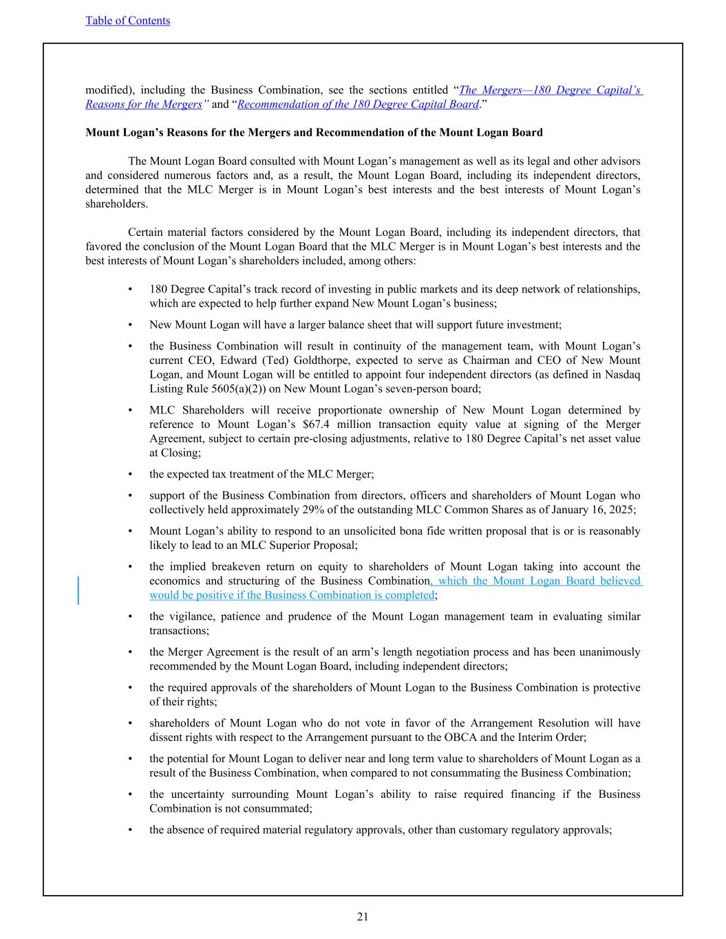 modified), including the Business Combination, see the sections entitled “The Mergers—180 Degree Capital’s Reasons for the Mergers” and “Recommendation of the 180 Degree Capital Board.” Mount Logan’s Reasons for the Mergers and Recommendation of the Mount Logan Board The Mount Logan Board consulted with Mount Logan’s management as well as its legal and other advisors and considered numerous factors and, as a result, the Mount Logan Board, including its independent directors, determined that the MLC Merger is in Mount Logan’s best interests and the best interests of Mount Logan’s shareholders. Certain material factors considered by the Mount Logan Board, including its independent directors, that favored the conclusion of the Mount Logan Board that the MLC Merger is in Mount Logan’s best interests and the best interests of Mount Logan’s shareholders included, among others: • 180 Degree Capital’s track record of investing in public markets and its deep network of relationships, which are expected to help further expand New Mount Logan’s business; • New Mount Logan will have a larger balance sheet that will support future investment; • the Business Combination will result in continuity of the management team, with Mount Logan’s current CEO, Edward (Ted) Goldthorpe, expected to serve as Chairman and CEO of New Mount Logan, and Mount Logan will be entitled to appoint four independent directors (as defined in Nasdaq Listing Rule 5605(a)(2)) on New Mount Logan’s seven-person board; • MLC Shareholders will receive proportionate ownership of New Mount Logan determined by reference to Mount Logan’s $67.4 million transaction equity value at signing of the Merger Agreement, subject to certain pre-closing adjustments, relative to 180 Degree Capital’s net asset value at Closing; • the expected tax treatment of the MLC Merger; • support of the Business Combination from directors, officers and shareholders of Mount Logan who collectively held approximately 29% of the outstanding MLC Common Shares as of January 16, 2025; • Mount Logan’s ability to respond to an unsolicited bona fide written proposal that is or is reasonably likely to lead to an MLC Superior Proposal; • the implied breakeven return on equity to shareholders of Mount Logan taking into account the economics and structuring of the Business Combination, which the Mount Logan Board believed would be positive if the Business Combination is completed; • the vigilance, patience and prudence of the Mount Logan management team in evaluating similar transactions; • the Merger Agreement is the result of an arm’s length negotiation process and has been unanimously recommended by the Mount Logan Board, including independent directors; • the required approvals of the shareholders of Mount Logan to the Business Combination is protective of their rights; • shareholders of Mount Logan who do not vote in favor of the Arrangement Resolution will have dissent rights with respect to the Arrangement pursuant to the OBCA and the Interim Order; • the potential for Mount Logan to deliver near and long term value to shareholders of Mount Logan as a result of the Business Combination, when compared to not consummating the Business Combination; • the uncertainty surrounding Mount Logan’s ability to raise required financing if the Business Combination is not consummated; • the absence of required material regulatory approvals, other than customary regulatory approvals; Table of Contents 21
