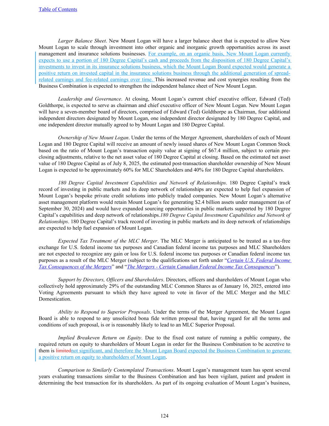 Larger Balance Sheet. New Mount Logan will have a larger balance sheet that is expected to allow New Mount Logan to scale through investment into other organic and inorganic growth opportunities across its asset management and insurance solutions businesses. For example, on an organic basis, New Mount Logan currently expects to use a portion of 180 Degree Capital’s cash and proceeds from the disposition of 180 Degree Capital’s investments to invest in its insurance solutions business, which the Mount Logan Board expected would generate a positive return on invested capital in the insurance solutions business through the additional generation of spread- related earnings and fee-related earnings over time. This increased revenue and cost synergies resulting from the Business Combination is expected to strengthen the independent balance sheet of New Mount Logan. Leadership and Governance. At closing, Mount Logan’s current chief executive officer, Edward (Ted) Goldthorpe, is expected to serve as chairman and chief executive officer of New Mount Logan. New Mount Logan will have a seven-member board of directors, comprised of Edward (Ted) Goldthorpe as Chairman, four additional independent directors designated by Mount Logan, one independent director designated by 180 Degree Capital, and one independent director mutually agreed to by Mount Logan and 180 Degree Capital. Ownership of New Mount Logan. Under the terms of the Merger Agreement, shareholders of each of Mount Logan and 180 Degree Capital will receive an amount of newly issued shares of New Mount Logan Common Stock based on the ratio of Mount Logan’s transaction equity value at signing of $67.4 million, subject to certain pre- closing adjustments, relative to the net asset value of 180 Degree Capital at closing. Based on the estimated net asset value of 180 Degree Capital as of July 8, 2025, the estimated post-transaction shareholder ownership of New Mount Logan is expected to be approximately 60% for MLC Shareholders and 40% for 180 Degree Capital shareholders. 180 Degree Capital Investment Capabilities and Network of Relationships. 180 Degree Capital’s track record of investing in public markets and its deep network of relationships are expected to help fuel expansion of Mount Logan’s bespoke private credit solutions into publicly traded companies. New Mount Logan’s alternative asset management platform would retain Mount Logan’s fee generating $2.4 billion assets under management (as of September 30, 2024) and would have expanded sourcing opportunities in public markets supported by 180 Degree Capital’s capabilities and deep network of relationships.180 Degree Capital Investment Capabilities and Network of Relationships. 180 Degree Capital’s track record of investing in public markets and its deep network of relationships are expected to help fuel expansion of Mount Logan. Expected Tax Treatment of the MLC Merger. The MLC Merger is anticipated to be treated as a tax-free exchange for U.S. federal income tax purposes and Canadian federal income tax purposes and MLC Shareholders are not expected to recognize any gain or loss for U.S. federal income tax purposes or Canadian federal income tax purposes as a result of the MLC Merger (subject to the qualifications set forth under “Certain U.S. Federal Income Tax Consequences of the Mergers” and “The Mergers - Certain Canadian Federal Income Tax Consequences”). Support by Directors, Officers and Shareholders. Directors, officers and shareholders of Mount Logan who collectively hold approximately 29% of the outstanding MLC Common Shares as of January 16, 2025, entered into Voting Agreements pursuant to which they have agreed to vote in favor of the MLC Merger and the MLC Domestication. Ability to Respond to Superior Proposals. Under the terms of the Merger Agreement, the Mount Logan Board is able to respond to any unsolicited bona fide written proposal that, having regard for all the terms and conditions of such proposal, is or is reasonably likely to lead to an MLC Superior Proposal. Implied Breakeven Return on Equity. Due to the fixed cost nature of running a public company, the required return on equity to shareholders of Mount Logan in order for the Business Combination to be accretive to them is limitednot significant, and therefore the Mount Logan Board expected the Business Combination to generate a positive return on equity to shareholders of Mount Logan. Comparison to Similarly Contemplated Transactions. Mount Logan’s management team has spent several years evaluating transactions similar to the Business Combination and has been vigilant, patient and prudent in determining the best transaction for its shareholders. As part of its ongoing evaluation of Mount Logan’s business, Table of Contents 124